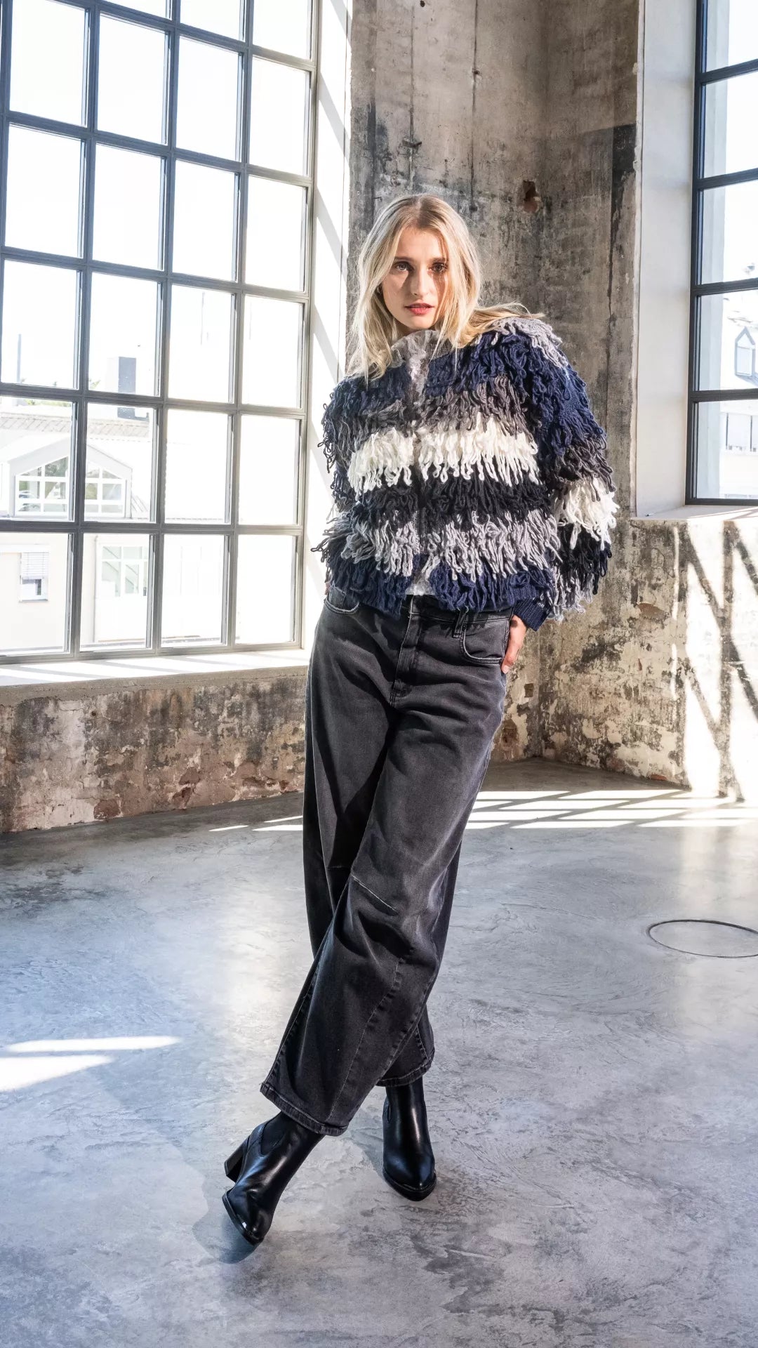 Rustikale Materialien und urbane Coolness vereinen sich in einem Look, der den Herbst zelebriert. Jeans, Leder und Strick schaffen ein spannendes Spiel aus Texturen.