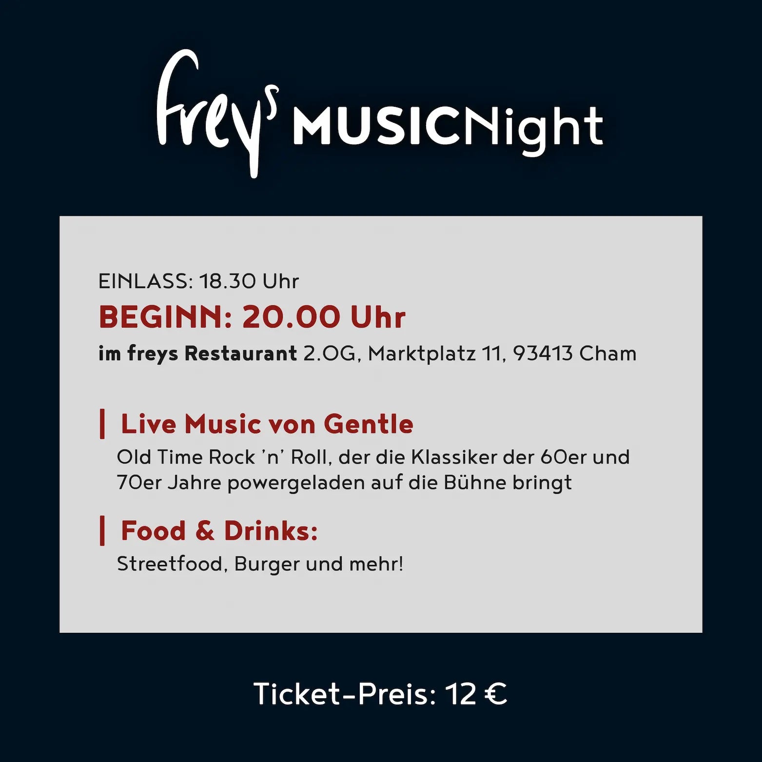 Old Time Rock'n Roll – live mit Gentle! Bei der zweiten freys Music Night in Cham erwartet dich ein unvergesslicher Abend voller Musik und Genuss.